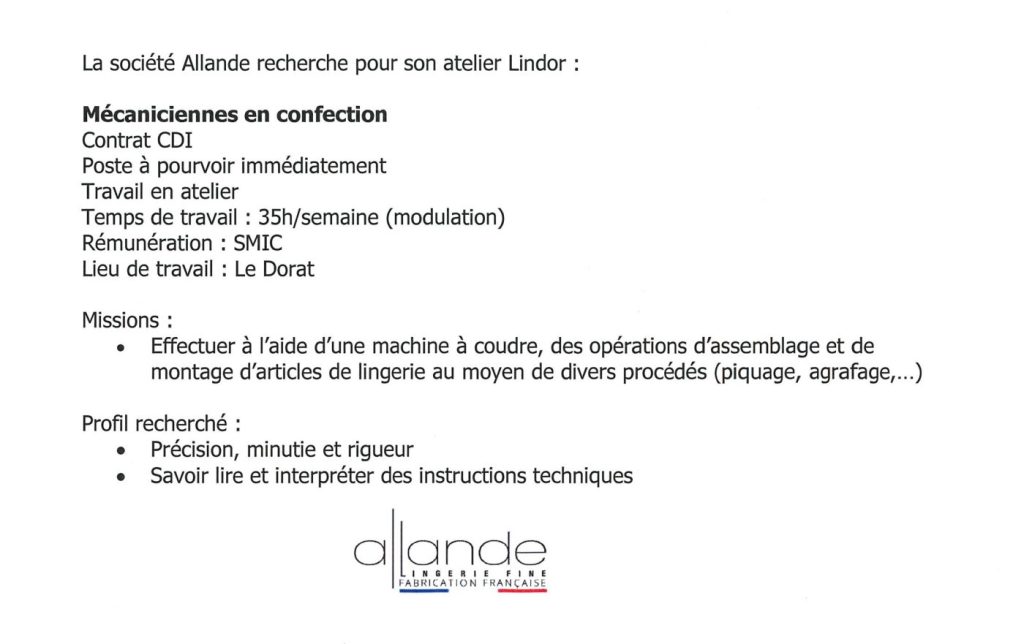 La société Allande recrute pour son atelier Lindor :